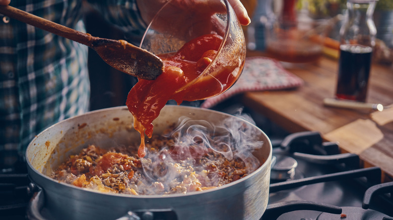 If you're buying your cans from American brands, it's likely they'll be made with calcium chloride. This ingredient is meant to help diced tomatoes keep their shape, but when most recipes want them to break down in a soup or sauce, the additive can actually make it harder for them to do so. To get around this obstacle, try pivoting to cans of Italian tomatoes since these companies will typically leave it out.