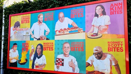 Head outside to one of the tables or booths, and there's no mistake you're in the world of streaming giants. Pillows are emblazoned with the words "Netflix Bites," and posters of the participating chefs adorn every wall.