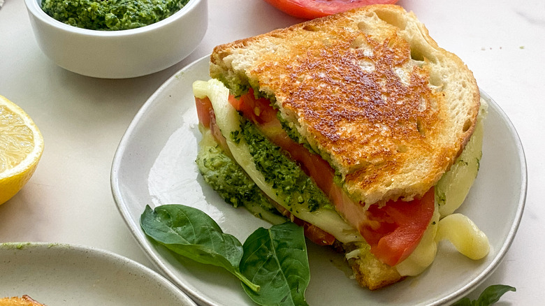 Recipe developer Miriam Hahn brings us this recipe and says, "With a garden overflowing with fresh basil, I whip up a batch of pesto weekly to use in various recipes. This sandwich is a notch up from your typical sandwich and definitely gives you restaurant vibes." This is a hearty sandwich and Hahn tells us it's a meal in itself but it pairs well with a simple green salad or a light spinach soup. Grab your cast iron skillet and let's make the sandwich of your dreams!