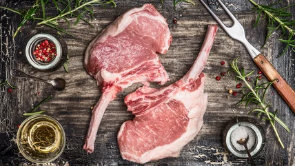 Also known as rack of pork or center-cut pork roast, this rib cut has a fat cap over a single muscle. Like most rib varieties, the meat around the bones becomes incredibly succulent once cooked. This pork roast is also quite lean compared to prime rib. A 4-ounce serving of pork rib roast has 370 calories with 21 grams of fat, while the same amount of beef rib has 437 calories and over 36 grams of fat. Pork in general is also much less expensive than beef. A cut of beef prime rib can cost over $30 a pound, while the pork cut is half that at around $15 per pound.
