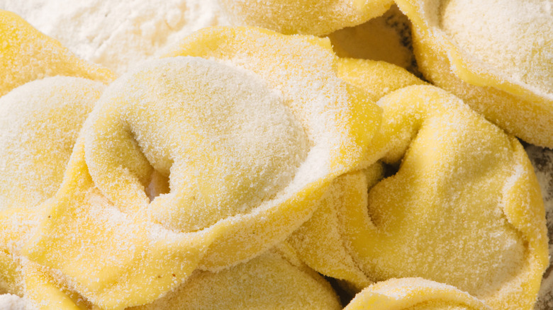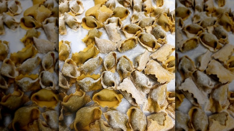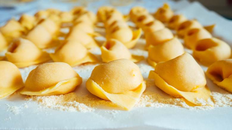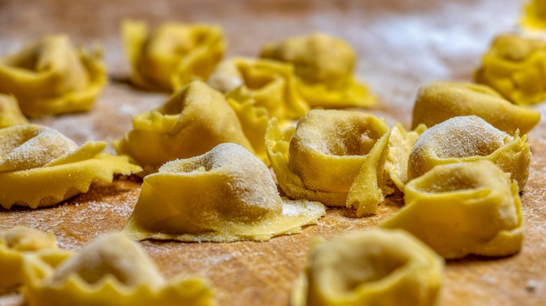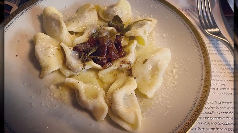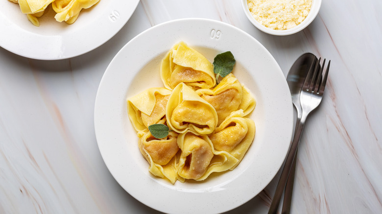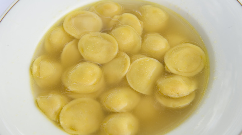 This dish's broth is unique, too, because it's made by cooking three kinds of meat, chicken, beef, and pork (salami), separately before bringing it all back together and tossing the pasta in it. The broth may also be made with veal, which is less common than the standard trio. Some versions of the recipe also stick to serving the pasta in butter seasoned with sage instead of opting for the broth entirely.
