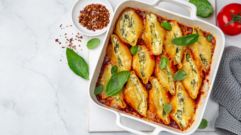 The key ingredient to making stuffed shells is pasta. Conchiglioni pasta is marketed as jumbo shells in the United States and also comes in smaller varieties: conchigliette (small) and conchiglie (medium). The jumbo shells are the easiest to stuff, thus making them the most popular pairing for this recipe. The dried shells are boiled until al dente before being stuffed, sauced, and baked with a cheese and herb garnish.