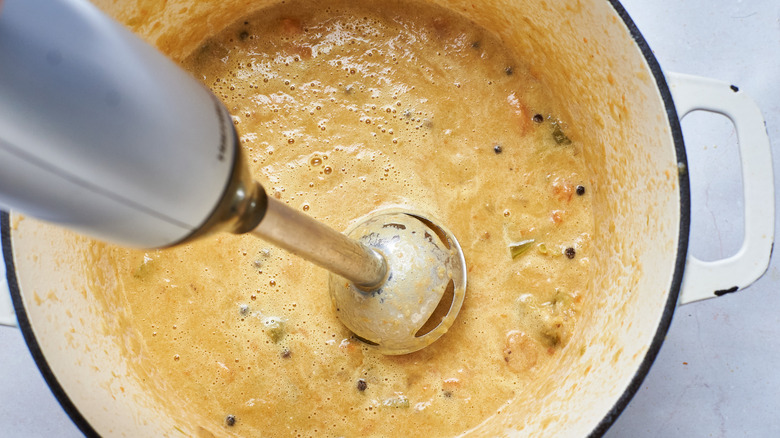 Take the lobster shells, tarragon stems, and bay leaves out of the pot and blend the mixture until it is smooth. Either place an immersion blender straight into the pot or carefully pour the contents into a blender. If you use the latter approach, pour the blended mixture back into the pot. "The final consistency should be that of a milkshake," our recipe developer describes. If your mixture is looking too chunky, "you may need to add water to blend smooth."
