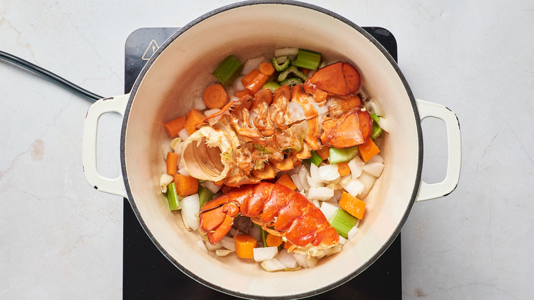- Add the lobster tails, onion, carrots, celery, and garlic and sweat the vegetables for about 10 minutes until they become glossy and begin to soften.