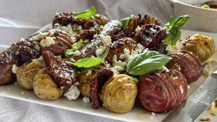 - Top the potatoes with the sun-dried tomatoes and reserved feta, adding additional salt and/or lemon juice if desired.