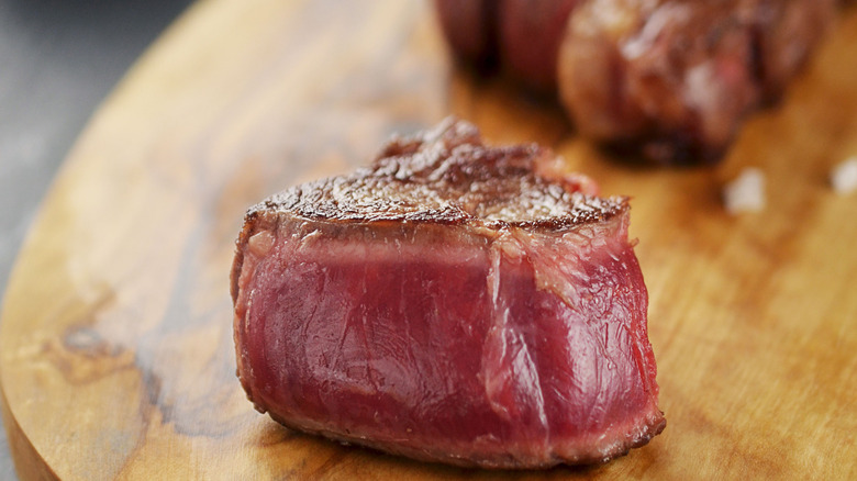 Grilled for a mere minute or two, blue steak is exactly what it sounds like — a cut cooked so rare the steak's internal color mimics the indigo tint of raw beef prior to oxygen exposure. And although the steak becomes somewhat warm during the cooking process, the center remains essentially raw. Because of this quick exposure to high heat, a nice sear or even char is achieved, which gave rise to the term, the "black and blue" steak.