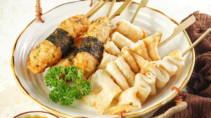 Eomuk is an essential ingredient in many Korean dishes. Similar to imitation crab in flavor, this subtly sweet and fishy treat adds protein and texture to any soup. Although there are countless forms of eomuk, the most popular kind comes in a thin sheet, around 2 to 3 mm thick. This eomuk is either sliced into smaller pieces to be stir-fried as banchan, or used in classic Korean dishes like kimbap and japchae. You'll also see it as eomuk tang, where large pieces of this sheet are folded and woven into large wooden skewers submerged in anchovy broth. These fishcake skewers are a classic snack found in Korean fast-food joints, almost always paired with spicy tteokbokki.