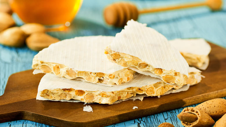 Turrón is made with a delicate balance of honey, sugar, egg whites, and loads of toasted almonds that give it its signature crunchy, caramel flavor. Like many Spanish recipes, its preparation is pretty straightforward and can be made at home if you're not up for a trip across the Atlantic or to your nearest Spanish grocery. Simply create a candy slush by heating the honey and sugar on the stove before carefully stirring in the egg whites, followed by the almonds, and allowing the mixture to cool on a baking sheet before cutting.