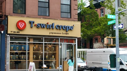 Once you start noticing these little shops labeled "T-swirl Crêpe" on the streets of New York, it's hard to stop — there's one in Flushing, Queens, another in the Ukrainian village, a third in Manhattan's Chinatown, and now yet another on Park Slope's Fifth Avenue in Brooklyn. The proliferation of this Japanese creperie acts as evidence in and of itself that T-swirl Crêpe is quickly building a big brand. The red logo features a curiously conical crepe surrounded by a circular cage; plastic mock-ups of the crepes are arranged in rows in the window, each in a glass bubble. The crepes themselves look like ice cream cones stuffed high with all manner of ingredients, from chunks of Angus beef to Pocky sticks. Unless you know Japanese crepes well, you're probably left wondering what makes them different from a classic French crepe and what those savory and sweet flavor combos could possibly taste like.