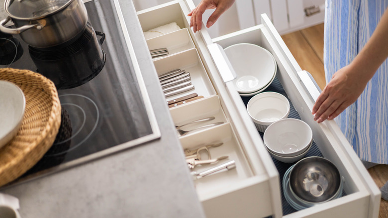 Sometimes, effective kitchen storage consists of finding creative applications for things that were never designed for the that space. This could range from using pants hangers in the pantry or storing spices in baby food jars. And for delicate dishware that needs better traction and a padded surface, look to a unique and unconventional solution: the shower mat. All it takes is a little imagination, and you can elevate your kitchen for ease of use and aesthetic sensibility.