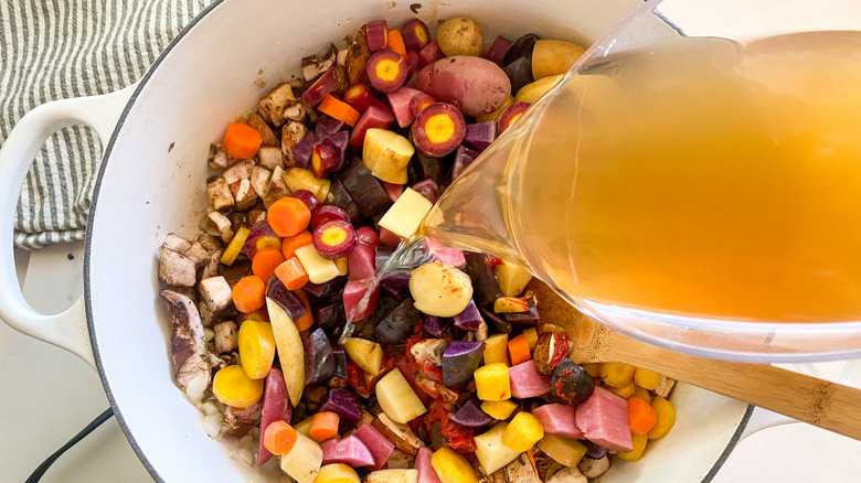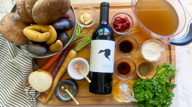 Then to give our "pot roast" a rich broth, we'll start with vegetable broth paired with red wine, tomato paste, vegan Worcestershire, soy sauce, salt, thyme, pepper, and corn starch. "If you prefer to not use the wine in this recipe, a vegan beef broth will do the trick," Hahn shares.