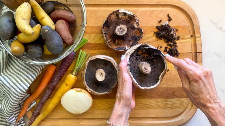 - Remove the gills of the portobello mushrooms caps by scraping them with a spoon. A grapefruit spoon is helpful if you have one. Chop the mushroom caps, potatoes and carrots into bite size pieces and dice the onion and garlic.
