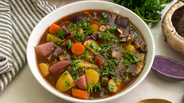 To make this recipe, we'll need a fair amount of produce so let's start our shopping spree in the produce aisle. Pick up some portobello mushrooms, potatoes, carrots, onion, garlic, and fresh parsley. "I love to use multicolored potatoes if I can find them because they don't need to be peeled and the different colors add different nutrients," Hahn remarks.