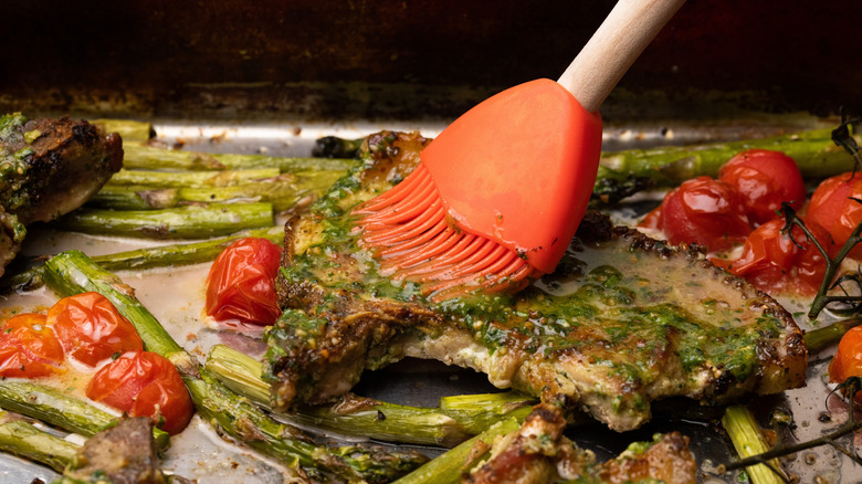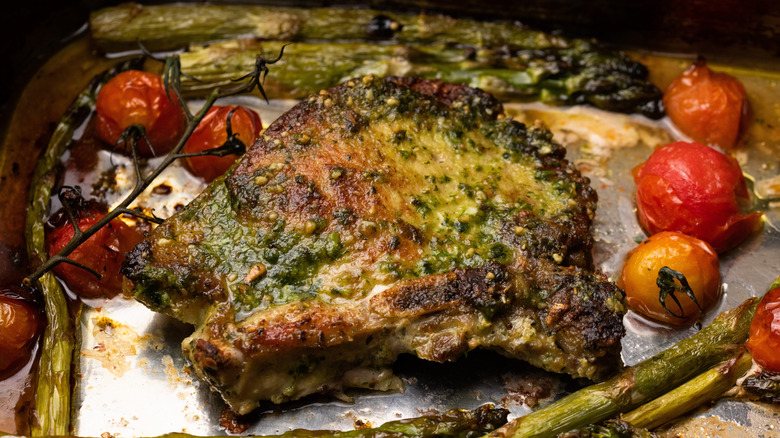 Nestle the pork chops alongside the tomatoes and asparagus, brush with any leftover pesto marinade, and then roast at 400 F for 7 to 8 minutes. The chops should be cooked through but still juicy. As with all meat dishes, always let the meat rest directly after cooking it. To do this, make a tent out of aluminum foil and use it to cover the pork chops for a few minutes before serving with your chosen accompaniment.