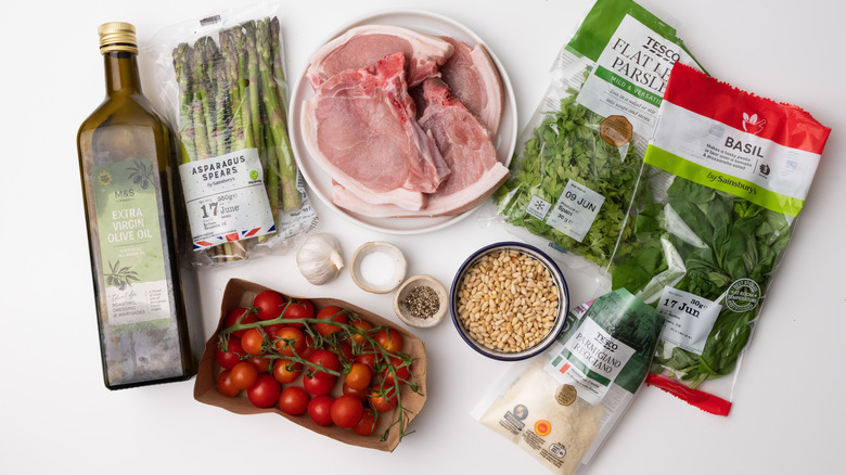 Gather the ingredients for this pesto-marinated pork chop recipe