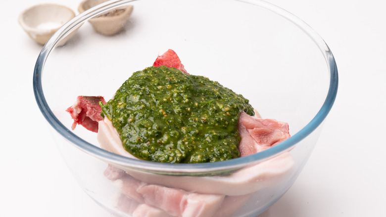 This recipe for pesto-marinated pork chops uses a homemade pesto marinade devised by Tasting Table recipe developer Jennine Rye and combines both basil and parsley for a really fresh and flavorful sauce that's a truly delicious accompaniment to pork chops. Once marinated, you can bake the pork chops in the oven, or if the weather is nice and you want to host a cookout, this recipe is also equally delicious when cooked on a grill.