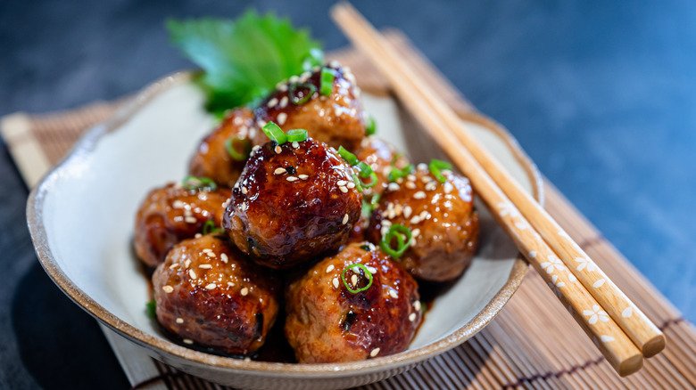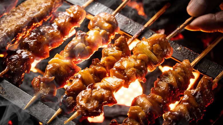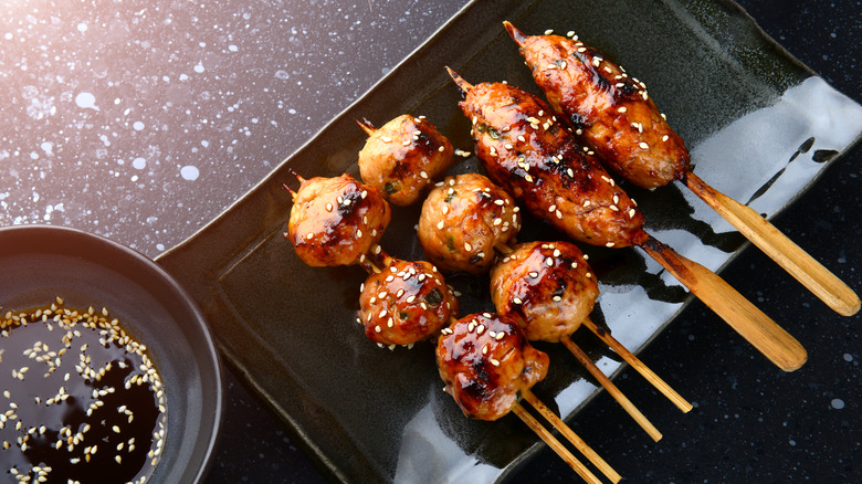 Out of all the skewer types, tsukune is one of the most variable. Since it's a ground chicken meatball, it can incorporate many different ingredients. There are regional renditions across Japan, which improvise in texture, as well as taste. Some chefs add cartilage for a chewier texture, while others add breadcrumbs for a softer version. Tsukune is served with tare, a sweet and sticky soy sauce-based dipping sauce. The condiment is frequently used as a baste during the cooking process, with the skewers dipped into the container several times during preparation. As a result, the oils and charred bits from the grill infuse into the tare, thereby seasoning its taste.