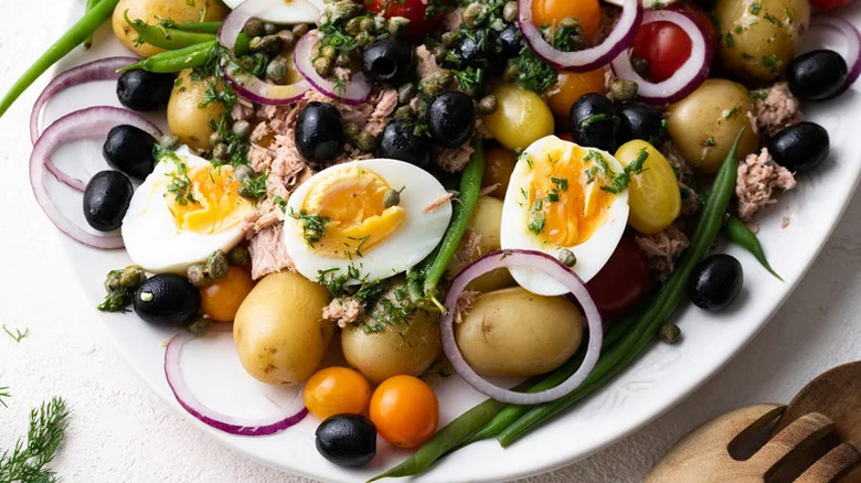 Want to make a salad that's going to impress your guests? You can't go wrong with a salad niçoise. Tuna plays a leading role in this salad recipe, but it's not the only ingredient you'll need. A good salad niçoise also contains ingredients like potatoes, tomatoes, olives, capers, and red onions, but feel free to add whatever other veggies you have on hand that you think would pair well with the tuna. We like using bright, briny veggies that complement the flavor of the tuna well.