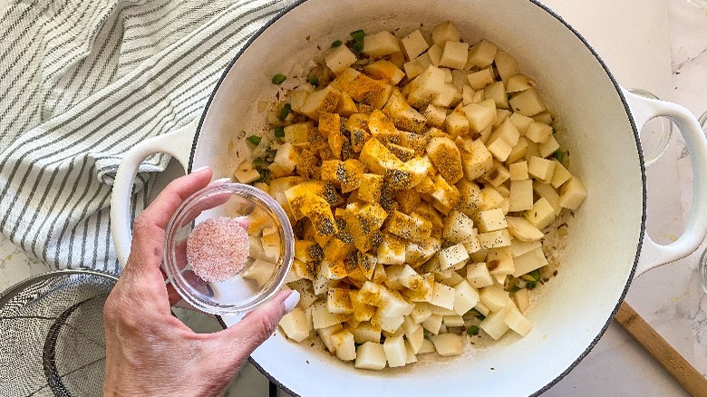 Now that the initial sauté is done, we can add the rest of the ingredients. Add the potatoes, curry powder, salt, pepper, and turmeric. Give the potatoes a good stir to distribute the spices and give them a nice, deep color. Pour in the broth and lower the heat to medium. Cook for 20 to 30 minutes, stirring every 5 to 10 minutes or so or until the potatoes are tender. "The final cook time will really depend on how big your potatoes are chopped, so start checking them at 20 minutes. We want them to be nice and tender but not mushy," Hahn explains.