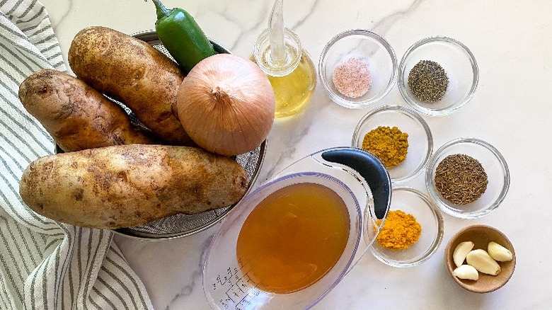 To make this recipe, we'll start by picking up three large potatoes, an onion, garlic, and a hot chile pepper. "You can use any type of chile pepper for this recipe depending on how spicy you want the dish to be. Sometimes a scotch bonnet pepper is used in this recipe, but be warned, that's one hot pepper. I typically use a jalapeño or a serrano because that's plenty of spiciness, and they are easy to find," Hahn explains. While you're in the produce aisle, you may want to grab some cilantro for topping your finished dish. We'll also need some oil, vegetable broth, and a handful of spices — cumin seed, curry powder, salt, pepper, and turmeric.