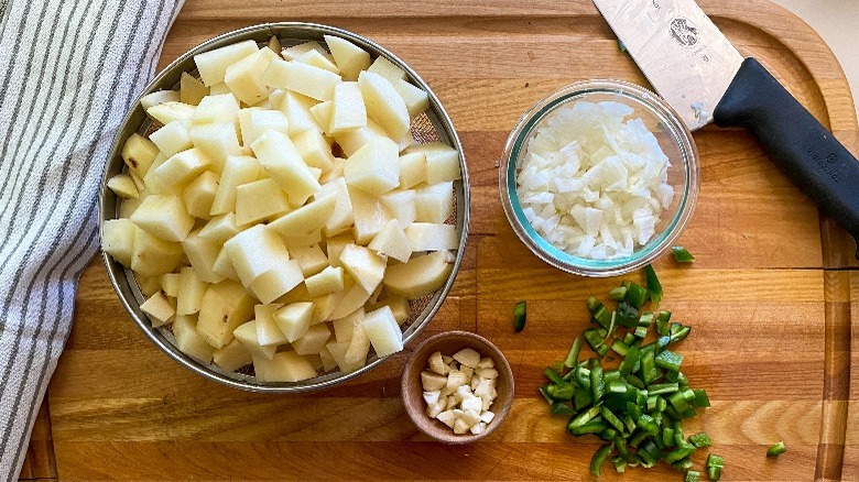 To get our vegetables ready, start by peeling the potatoes and then dicing them into about ½-inch pieces. Then go ahead and dice the onion, garlic, and chile pepper. "I always remove the seeds in whatever chile pepper I'm using because those add extra heat, and I also don't want seeds floating around in the finished recipe," Hahn shares.