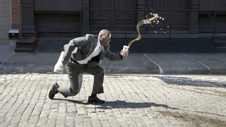 Alternate scene: You and your clandestine wad of napkins did a pretty lousy job erasing the spilled coffee and now there's a huge sticky spot on the floor. Gross. Even worse, maybe that spot isn't even sticky yet — it's still just wet. This is the exact type of scenario for which coffee shops have "Caution: Wet Floor" signs to prevent slipping. More seriously, the ideal coffee-brewing temperature is 205 degrees Fahrenheit, and if your coffee is even at 150 degrees, somebody is going to get scalded if they touch it.
