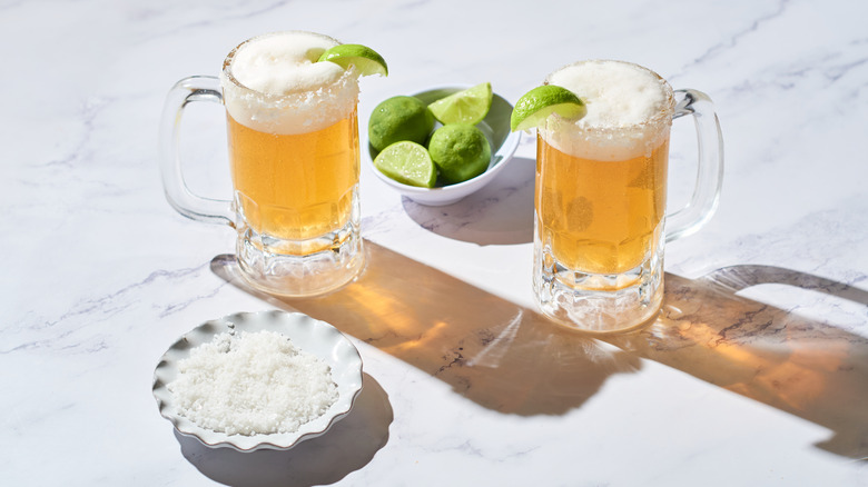 Unlike the British "beertails" on this list, this classic beer cocktail hails from Mexico. The Chelada mixes Mexican lager, like Modelo or Corona, and lime juice together to create a cool, citrusy drink. If you want an extra tangy taste to the drink, add a salt rim to the glass. Cheladas are great for outdoor gatherings, as well as for accompanying food. Better yet, they can easily be batched to make quick and easy servings for big groups.