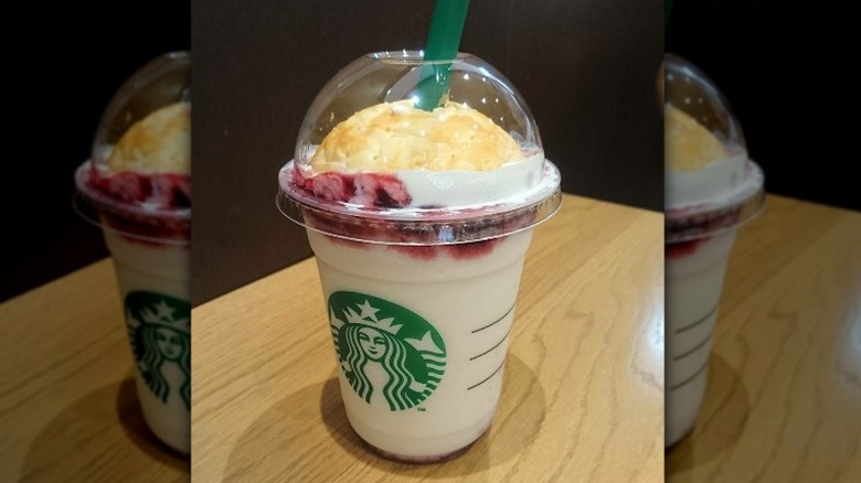 Every Starbucks Frappuccino wouldn't be complete without its signature topping of whipped cream. However, to truly encapsulate the spirit of a classic American cherry pie, this Frappuccino is garnished with an unusual addition — a domed pie crust lid, effectively transforming the beverage into a drinkable dessert.