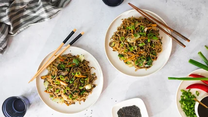The stir-fry itself is ready to go, so sprinkle on the chopped scallions and black sesame seeds for garnish and dole out equal servings of the vegetarian dish. "An appetizer that would work perfectly with these noodles would be steamed edamame with soy sauce and chili oil," suggests Douglas. "It's such an easy, satisfying starter, and would pair brilliantly with these black sesame veggie noodles."