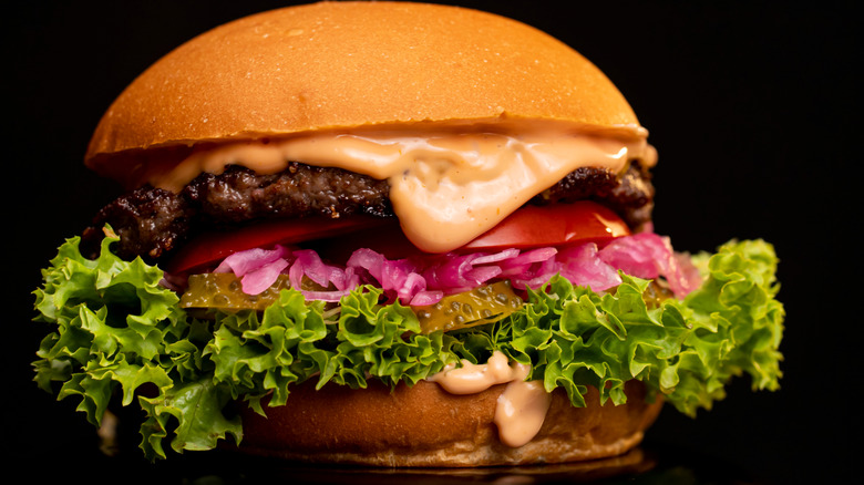 Burgers are hearty, delicious crowd-pleasers that are easy to make and simple to customize. This versatility is taken even further when you look beyond the patty to its toppings. Burger accouterments come in endless permutations — so many that it can be hard to decide which to use yourself. If you're looking to try a new topping this cookout season, pickled red onions can take your burger to the next level.