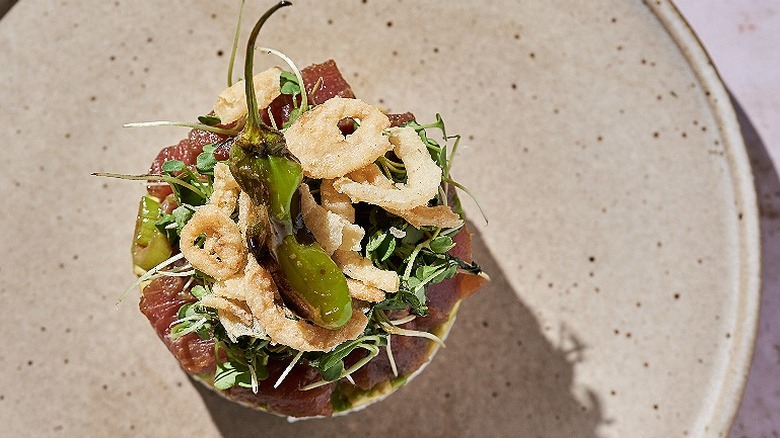 - Add a generous pinch of microgreens on top of the tuna, then sprinkle with fried onion pieces. To finish each stack, top with a blistered shishito pepper, and serve immediately.