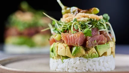 - To build the stack, place a biscuit cutter or ring mold on a plate. Place about ¼ cup rice into the bottom of the mold, pressing down to make the top flat and even. Add the avocado pieces next, using about ¼ cup per stack and pressing down so the avocado is even across the top. Lastly, add about ¼ cup tuna, then press down on the tuna with a spatula and slide the mold up and off of the plate. Repeat with the remaining ingredients. (You should end up with 6 stacks.)