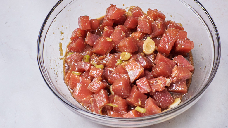 - 1 pound sushi grade ahi tuna, cut into ½-inch cubes