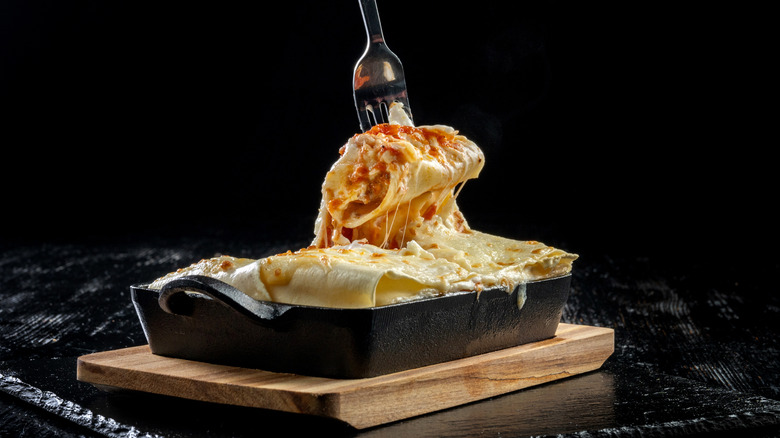 And here's a bonus for travelers: lasagna is incredibly portable. Its fairly rigid structure means you can easily cut it into square or rectangle-shaped portions and store it in a Tupperware container to bring with you. If it's still warm, you can wrap it in foil to retain the heat even longer. You also don't have to worry when it has cooled down over the course of your trip. Lasagna can be easily reheated on a stovetop, in an oven, or in a microwave.