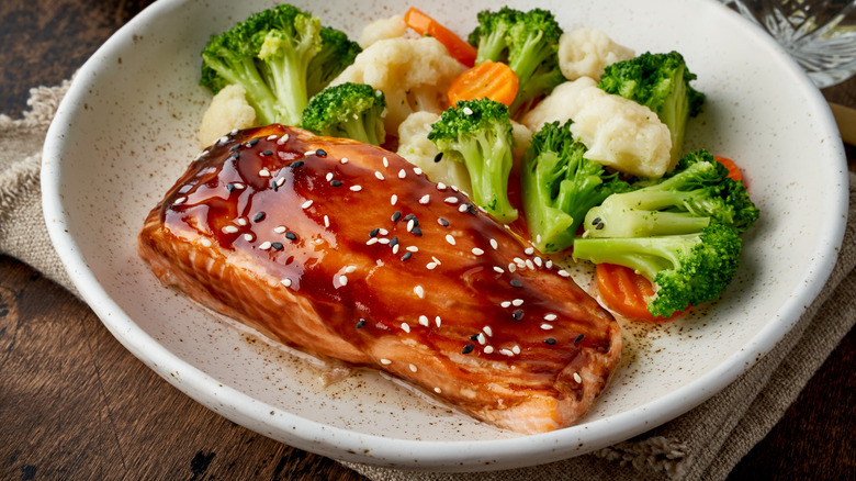 Teriyaki sauce, soy sauce, and rice wine are often flavored with additional ingredients like ginger and garlic, then simmered in a saucepan until it's thickened. Both garlic and ginger are strong flavors, so preparing your own teriyaki sauce lets you be as heavy-handed or as sparing with your additional flavors as you like. The possibilities don't end there, either. You can spice things up with chili paste or hot sauce, add a rich kick of sesame oil, or even some pungent wasabi. And as for what to do with your sauce when you've finished it — there's no end to delicious uses for it.