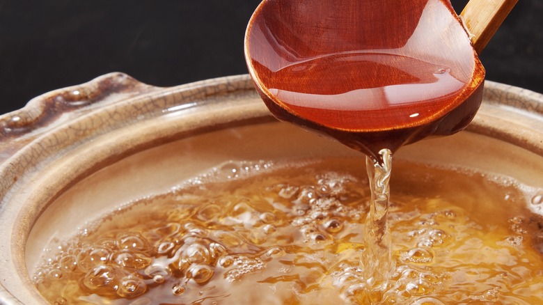 Those of us who love our teas will understand Chang's preference for steeping his ingredients. The method entails allowing ingredients — whether it is tea leaves or dashi — to sit in hot water for long enough that we are left with either beverage (tea) or broth (dashi). And while we hardly associate the act of making tea with chemistry, steeping actually gives flavor molecules a chance to move around, traveling from an area where they are clustered to places where they have yet to be found. If you do decide to do things differently from Chang and simmer your dashi, it's important to ensure that the broth doesn't reach boiling point, which could leave you with a bitter-tasting liquid.