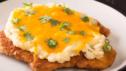 The regional dish where I'm originally from is the "parmo." It's a wide, flat, fried chicken, pork, or veal disk doused in bechamel sauce and cheese and then grilled so the toppings melt together. Despite the name, the cheese in question isn't parmesan. Instead, it's whatever mild yellow cheese blend that restaurants in the area also use for pizza. Chicken is the most popular protein, a few prefer pork, and the veal edition is essentially extinct these days.