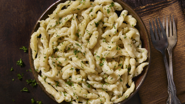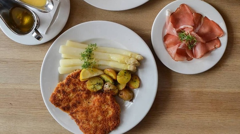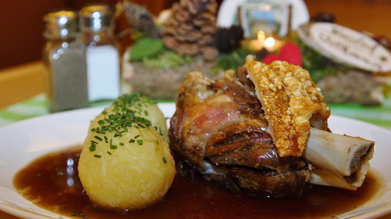 German food is best described as hearty, comforting, and heavy. Heaping plates of slow-roasted meats that swim in rich gravies served with fist-sized dumplings or piles of braised sauerkraut, along with platters of shiny, smokey bratwurst with zesty mustard and perfectly crisped schnitzel with flecks of sea salt and a mound of potato salad are just a few of the things that make Germany a glutton's delight. Meanwhile iconic street foods like currywurst and doner kebab come with distinct origin stories, serving as an edible representation of Deutschland's rich history. And that's not even counting the bread — tangled pretzels, chestnut-hued pumpernickel, cute little bröchten, and fluffy milchbrötchen entice even the strictest of dieters.
