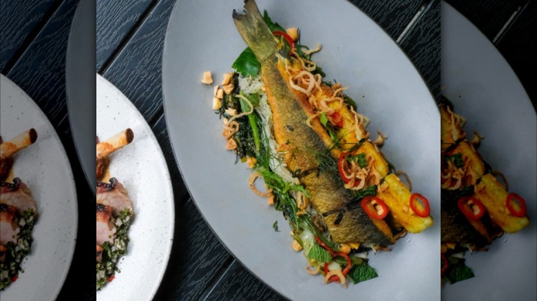 Recently, we did the salmon baked in clay with a fig leaf, figs, and fennel. The fig, the fennel, the sumac, the fennel pollen, and the salmon are baked in clay. We bring a new interpretation, because it's fig season now. It's salmon season in Alaska, Alaskan king salmon. The fennel is so perfect with that. We often revisit dishes and create new ones.