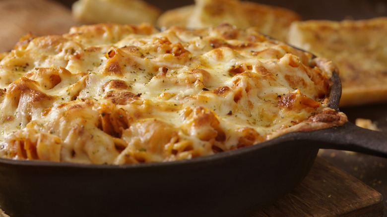 If you're not a fan of crispier melted cheese on your pasta bake — or you're simply hoping for the signature gooeyness that indicates your dish is perfectly done — ditch the chunks of raw cheese for a mornay sauce. You'll need to make its base, a béchamel sauce, first — for one cup of béchamel, combine one tablespoon of flour with one tablespoon of melted butter to create a paste, and cook on a stovetop on medium-low heat until golden brown. Then, slowly stream in one cup of milk and whisk until the sauce has fully combined and thickened. Finally, to create your mornay, add in your cheese — mozzarella, parmesan, or gruyère are recommended — and stir until melted.