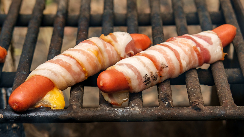 Even when served at their simplest, hot dogs are pretty tasty. Yet, we can probably all agree that there's room to make them a touch more interesting. Bun options and topping choices can definitely work to dress up hot dogs, and there's an opportunity to amp up the flavor before wieners even hit the grill by wrapping them in bacon. But why stop there? Add some cheese, and now you've got a bacon-wrapped hot dog that goes a step above the rest.