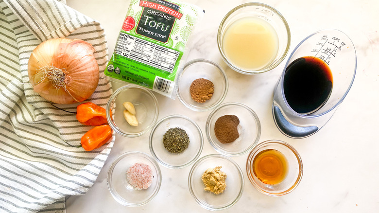 Gather the ingredients for jerk-marinated grilled tofu