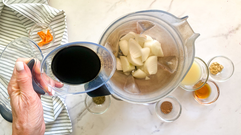 "I love sauces that go into the blender because it means you can quickly give things a rough chop since we're going to be blending anyway," Hahn remarks.