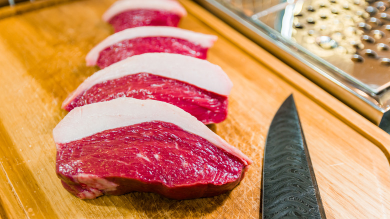 The first thing that catches the eye is the coulotte roast's fat cap, sitting like a thick white blanket over the deep-red, striated meat below. This can turn some people off, but it's one of the signature features of the cut and why many others love it. While some cooks prefer to have this removed by their butcher — and some butcher's remove it automatically — the fat cap contributes much to the flavor of the coulotte roast and helps keep the meat moist while cooking.