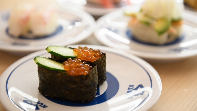 Kaitenzushi or conveyor belt sushi restaurants offer an expedient and amusing way to have sushi delivered to your table. Plates of sushi (often covered in clear lids) revolve around the restaurant on conveyor belts, allowing customers to choose their favorite varieties. At most of these establishments, they don't even have waitstaff to clear your plates. So, when you're done eating your sushi, you simply pop the plate into a slot at your table, and it journeys down a water slide or tunnel of rushing water to the massive dish-washing station in the kitchen.