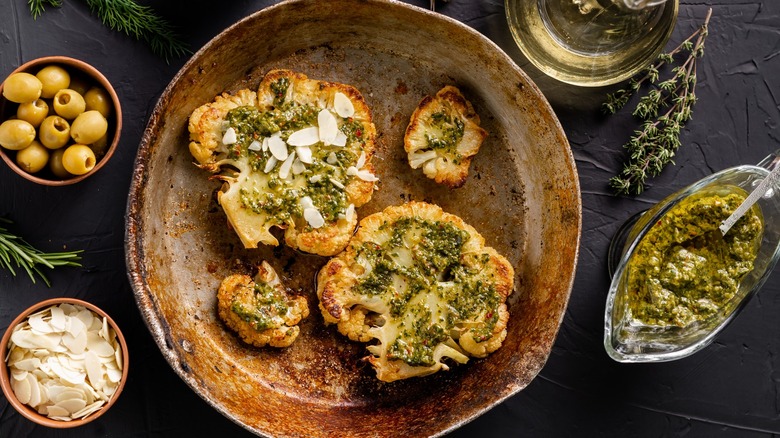 This cruciferous vegetable has been on the plant-based market for some time now — it got a makeover in the late 2010s and went from a sad, soggy, and bland side to a global food trend, in huge part due to the embrace of celebrity chefs like Yotam Ottolenghi. Perhaps that's why many roasted cauliflower recipes have a noticeable Middle Eastern influence: Israeli cauliflower steaks, for instance, are served with labneh, zaatar, and almonds, and Ottolenghi's own recipe pairs them with a tahini-based mash and capers.