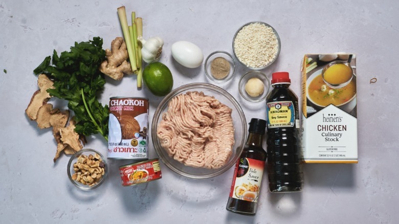 For this soup, you'll need coconut milk which adds flavor and helps thicken the soup, as well as ground chicken for the meatball base. You'll also need an egg, palm sugar, garlic, ginger, lemongrass, cilantro, dried galangal, fish sauce, soy sauce, white pepper, panko breadcrumbs, chicken stock, peanuts, a lime, and red curry paste. "I like the brand Maesri, and they have a tin of paste labelled 'red curry' that is also sometimes labelled as 'kaeng kua.' That being said, if you don't have access to Maesri, your grocery store will likely have something labelled as 'thai red curry paste,'" McGlinn notes. She also says that galangal "may be hard to find," and "can be omitted if needed, especially if you have kaeng kua curry paste."