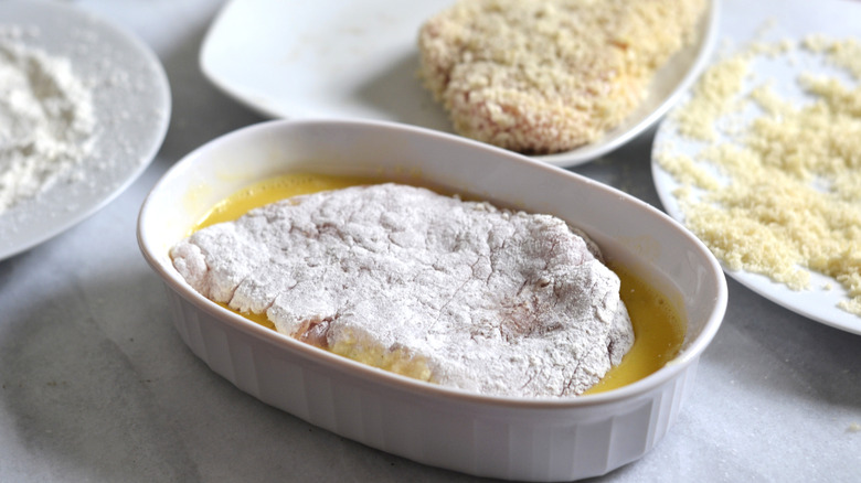 - Prepare your dredging station with a plate each of the flour and panko, as well as a bowl of the beaten egg. Coat each cutlet with flour (making sure to dust off the excess), then the egg, and finally the panko.