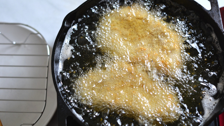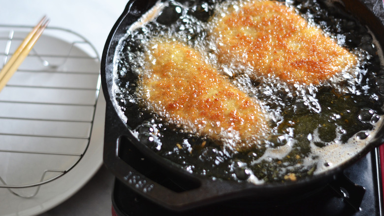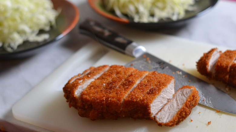Much like other fried foods, tonkatsu is even better when fried twice. To get your frying station ready, add the oil to a deep pan or skillet and bring the heat to high — it's important that the oil is hot enough to crisp up the bread crumbs. To test the heat, Hoffman suggests dropping some panko into the pan to see if it sizzles and floats. If so, you're ready to add your cutlets to the oil. Simply drop them in (individually or both at the same time, depending on the size of your pan), and let them cook for 3 minutes, flipping them over after 90 seconds. When they're nice and golden brown, remove them from the pan and let them cool on a rack for 3 more minutes.
