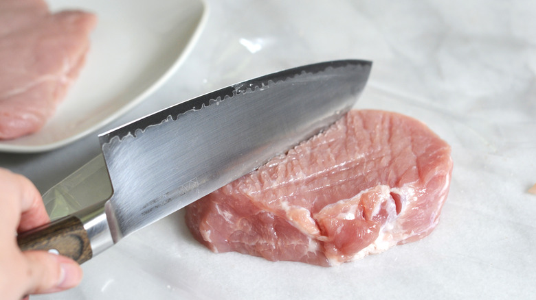 Get started by prepping the pork. You want to pound or roll out the meat until it's an even thickness — about ¼-½ inch — which Hoffman explains will help the pork cook more uniformly. You can use a meat tenderizer if you have one, but you can also use the top ridge of a knife (as Hoffman does) or a rolling pin. If you use a rolling pin, just put the meat cutlets in a plastic bag first to avoid transferring the juices to your pin.